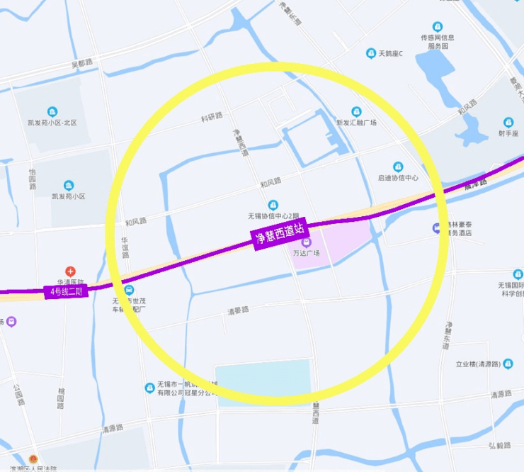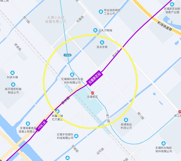 无锡新区站位于新华路与珠江路叉路口东南侧地块内,与既有3号线实现换乘,同时连接沪宁城际铁路。