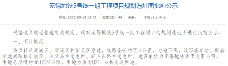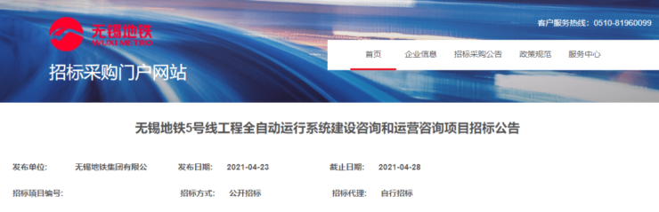 早在去年4月下旬,无锡地铁官网就公布了“无锡地铁5号线工程全自动运行系统建设紫云和运营咨询项目招标公告”。
