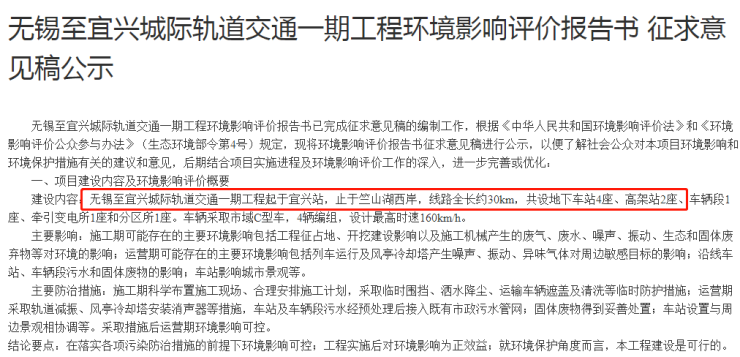 5月16日,无锡地铁官网公布了“无锡至宜兴城际轨道交通一期工程环境影响评价报告书征求意见稿公示”。