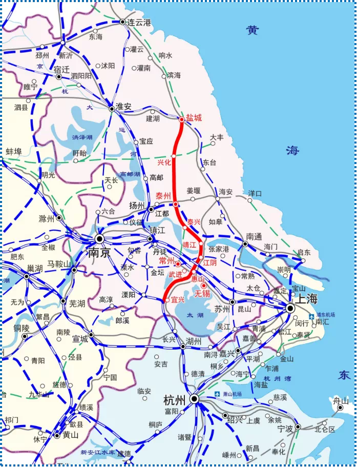 盐泰锡常宜铁路北承青盐、徐宿淮盐铁路,中联北沿江高铁、南沿江城际铁路、沪宁城际,南接宁杭高铁,形成纵贯鲁东南、苏北、苏中、苏南及浙江地区的快速客运通道。