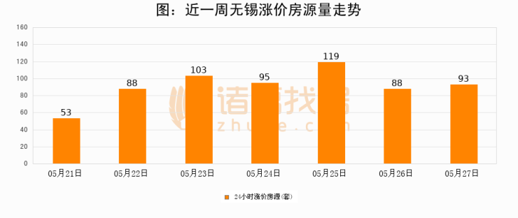 根据诸葛找房数据显示,无锡24小时涨价房源量为93套,较05月26日增加5套,环比上涨5.7%。与此同时,涨价房源占比小幅扩大,业主信心有所提升。
