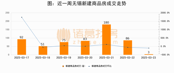 根据无锡市房地产市场管理和监测中心数据显示,2025年03月23日无锡新建商品房成交3套,较昨日减少83套,环比下降96.5%