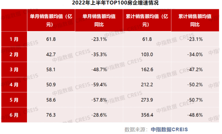 中指研究院较新统计显示,上半年TOP100房企销售额均值356.4亿元,同比下降48.6%,相较1-5月降幅持续收窄,房企销售业绩边际性改善;销售额破千亿房企9家,较去年同期(19家)减少10家;百亿房企85家,较去年同期(132家)减少47家。