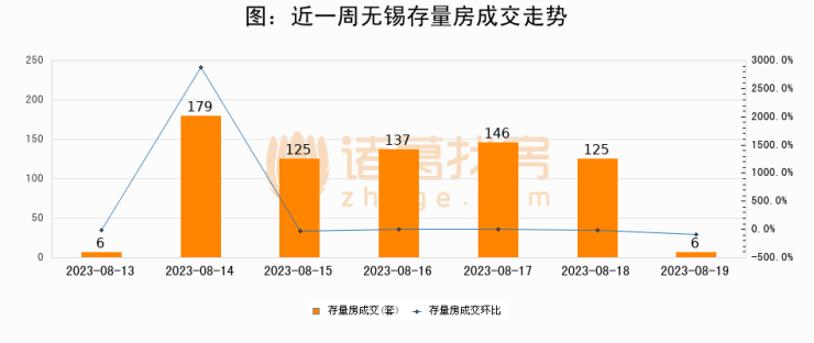 从存量房来看,2023年08月19日无锡存量房单日成交6套,比昨日减少119套,环比下降95.2%。从近一周存量房成交来看,无锡存量房日均成交套数为103套,08月19日单日成交6套,低于近一周平均水平94.2%。