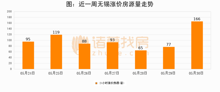 根据诸葛找房数据显示,无锡24小时涨价房源量为166套,较05月29日增加89套,环比上涨115.6%。与此同时,涨价房源占比小幅扩大,业主信心有所提升。