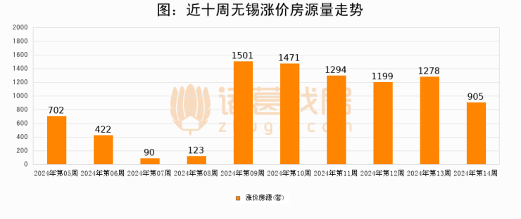 从调价房源来看,第13周无锡涨价房源905套,较上周下降29.2%。与此同时,13周涨价房源占比提升1.52个百分点,业主信心持续恢复。
