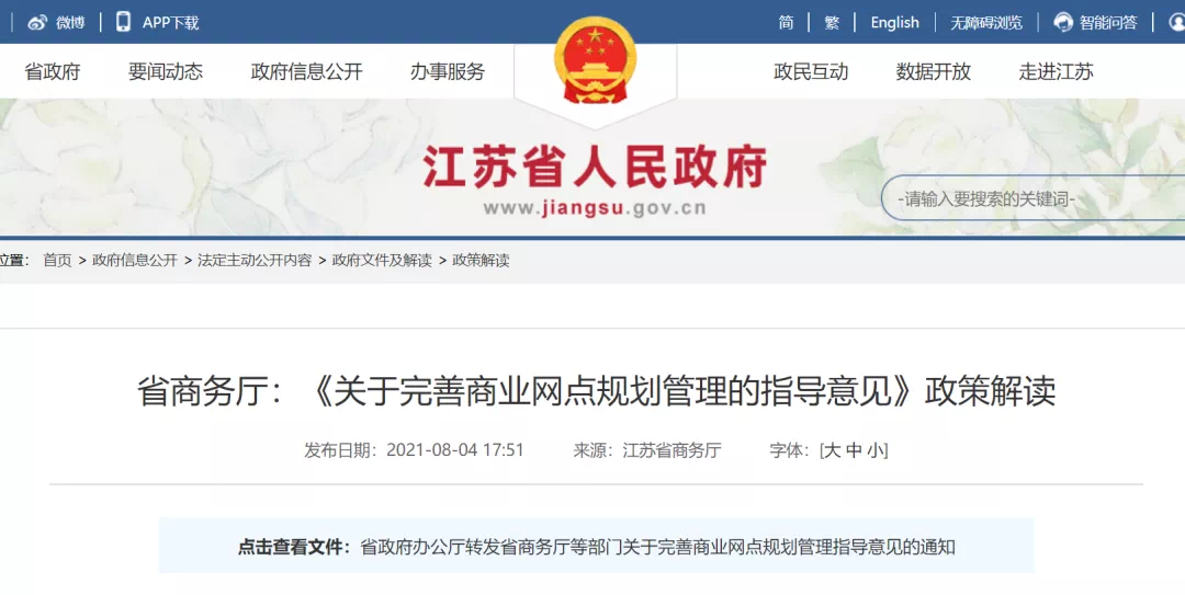 近日,江苏省官网发布《关于完善商业网点规划管理的指导意见》的政策解读。
