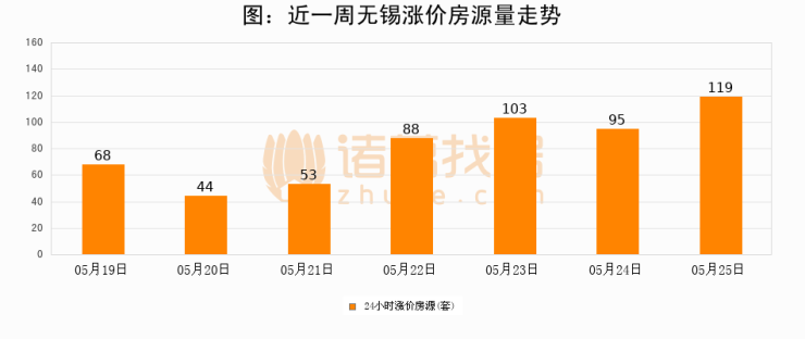 根据诸葛找房数据显示,无锡24小时涨价房源量为119套,较05月24日增加24套,环比上涨25.3%。与此同时,涨价房源占比小幅扩大,业主信心有所提升。