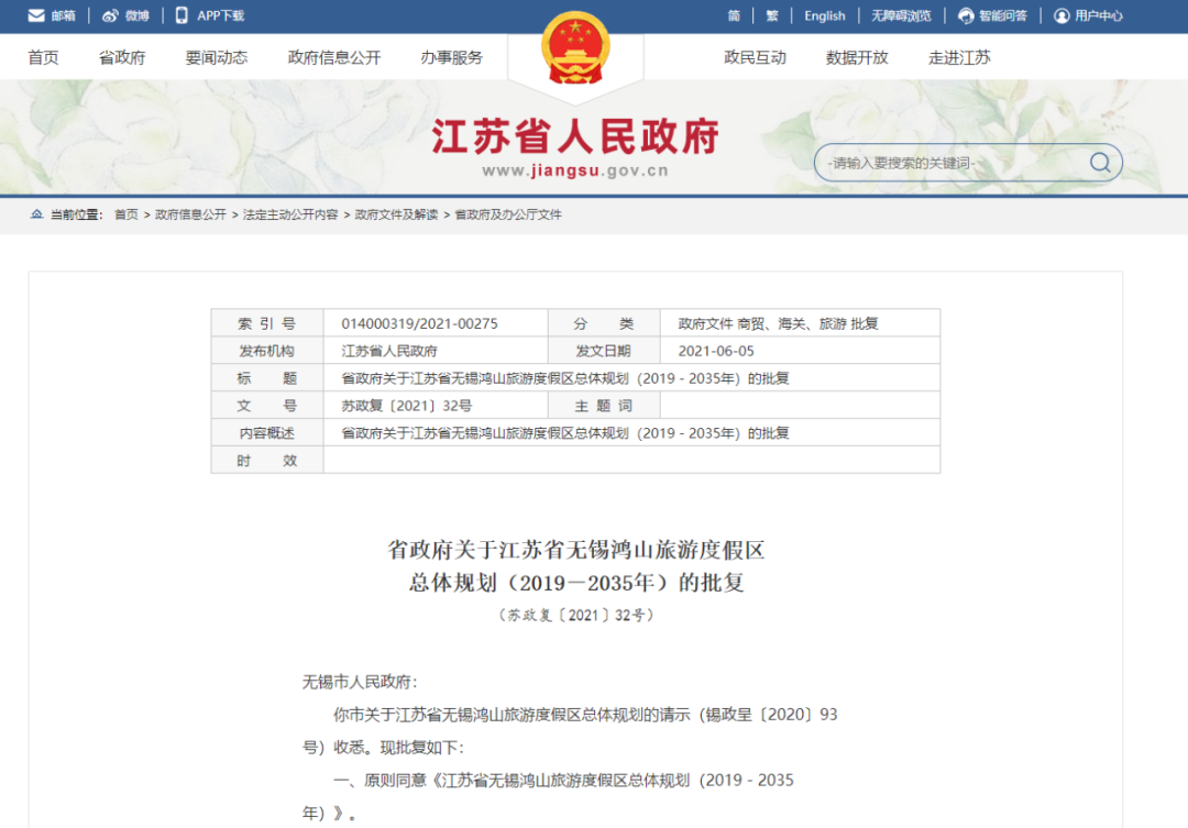 近日《江苏省无锡翠屏山旅游度假区总体规划(2019-2035)》《江苏省无锡鸿山旅游度假区总体规划(2019-2035)》获省政府批复。