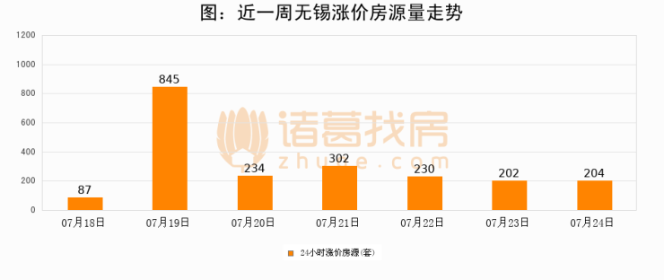 根据诸葛找房数据显示,无锡24小时涨价房源量为204套,较07月23日增加2套,环比上涨1%。与此同时,涨价房源占比小幅扩大,业主信心有所提升。