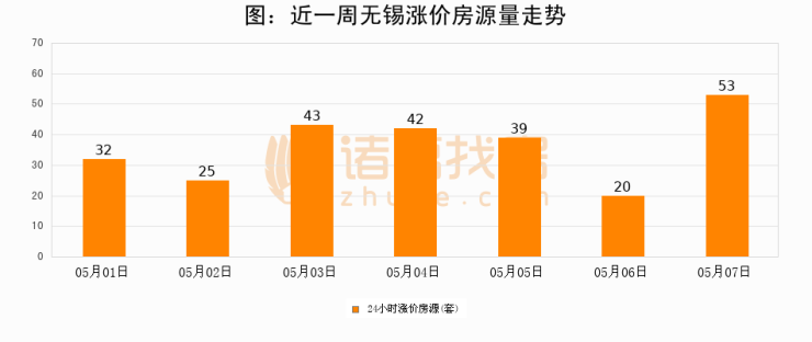 根据诸葛找房数据显示,无锡24小时涨价房源量为53套,较05月06日增加33套,环比上涨165%。与此同时,涨价房源占比小幅扩大,业主信心有所提升。