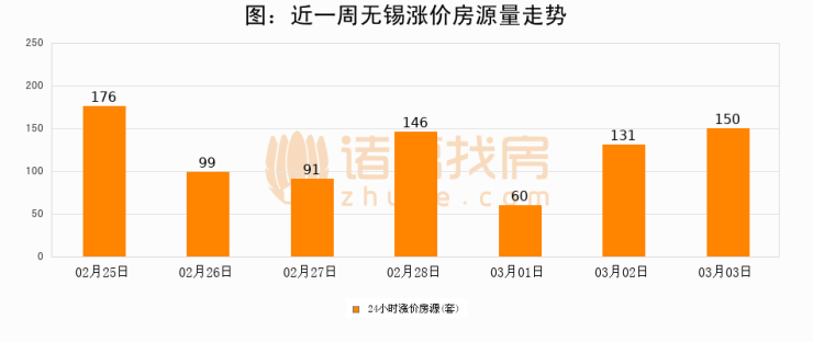 根据诸葛找房数据显示,无锡24小时涨价房源量为150套,较03月02日增加19套,环比上涨14.5%。与此同时,涨价房源占比小幅扩大,业主信心有所提升。