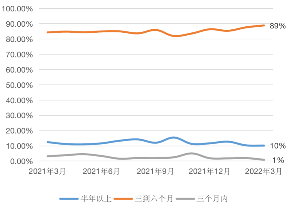 2022年3月,购房者信心尚未恢复。根据CRIC客户调研数据显示,计划三个月内买房的客户比例降至1%,而三到六个月内购房需求有所提振,但受困于疫情形势越发严峻,市场热度尚未回温。
