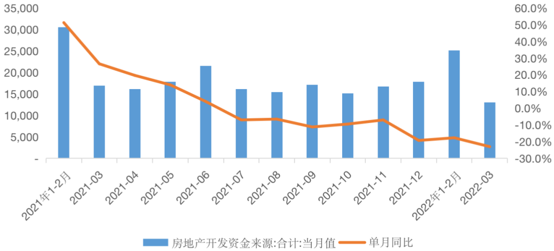 国家统计局数据显示,3月到位资金13016亿元,同比下降23.0%,降幅环比扩大5.3个百分点,从而使得到位资金的累计值降幅进一步扩大,2022年1-3月到位资金为38159亿元,同比下降19.6%,降幅环比1-2月的17.7%进一步扩大。