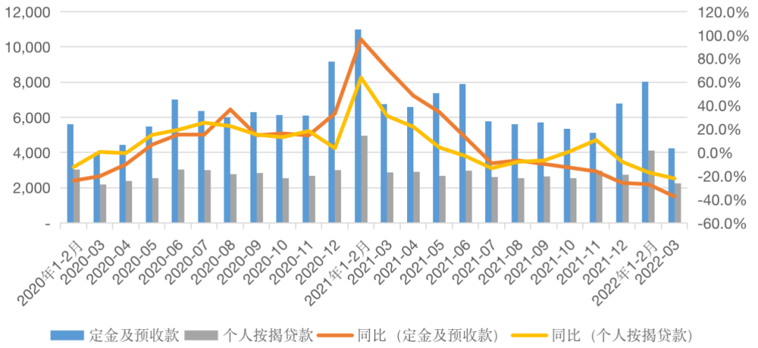 图:2020年以来房地产到位资金(定金及预收款)、(个人按揭贷款)当月值及同比(单位:亿元,%)