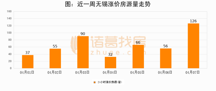 根据诸葛找房数据显示,无锡24小时涨价房源量为126套,较04月06日增加70套,环比上涨125%。与此同时,涨价房源占比小幅扩大,业主信心有所提升。