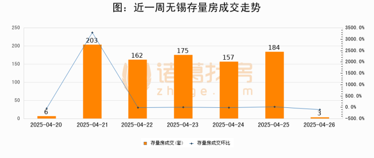 从存量房来看,2025年04月26日无锡存量房单日成交3套,比昨日减少181套,环比下降98.4%。从近一周存量房成交来看,无锡存量房日均成交套数为127套,04月26日单日成交3套,低于近一周平均水平97.6%。