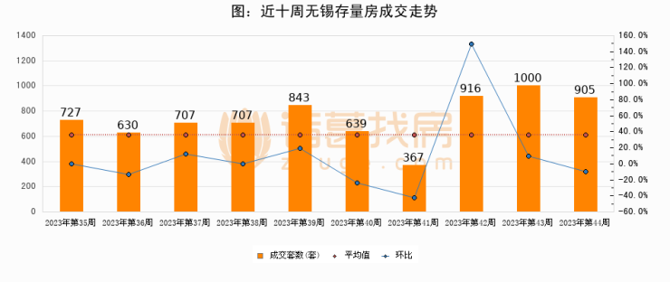 存量房方面,第44周无锡存量房成交905套,较上周减少95套,环比下降9.5%。从近十周成交走势来看,周均成交套数为744套,本周高于平均水平21.6%。