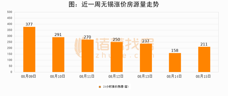 根据诸葛找房数据显示,无锡24小时涨价房源量为211套,较08月14日增加53套,环比上涨33.5%。与此同时,涨价房源占比小幅扩大,业主信心有所提升。