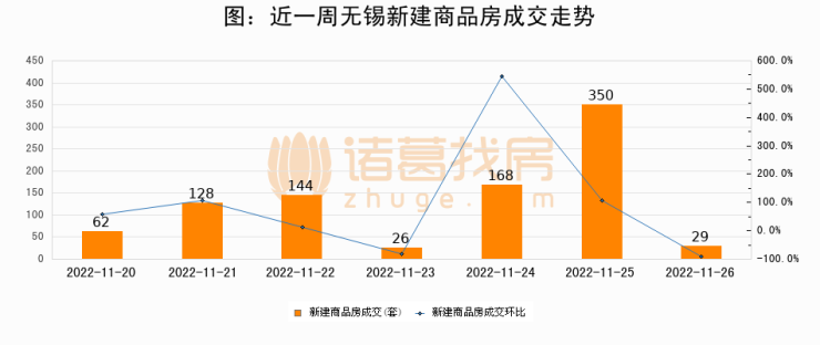 根据无锡市房地产市场管理和监测中心数据显示,2022年11月26日无锡新建商品房成交29套,较昨日减少321套,环比下降91.7%。近一周无锡新建商品房日均成交130套,其中,11月25日成交量最高为350套。11月26日单日成交29套,低于近一周平均水平77.7%。