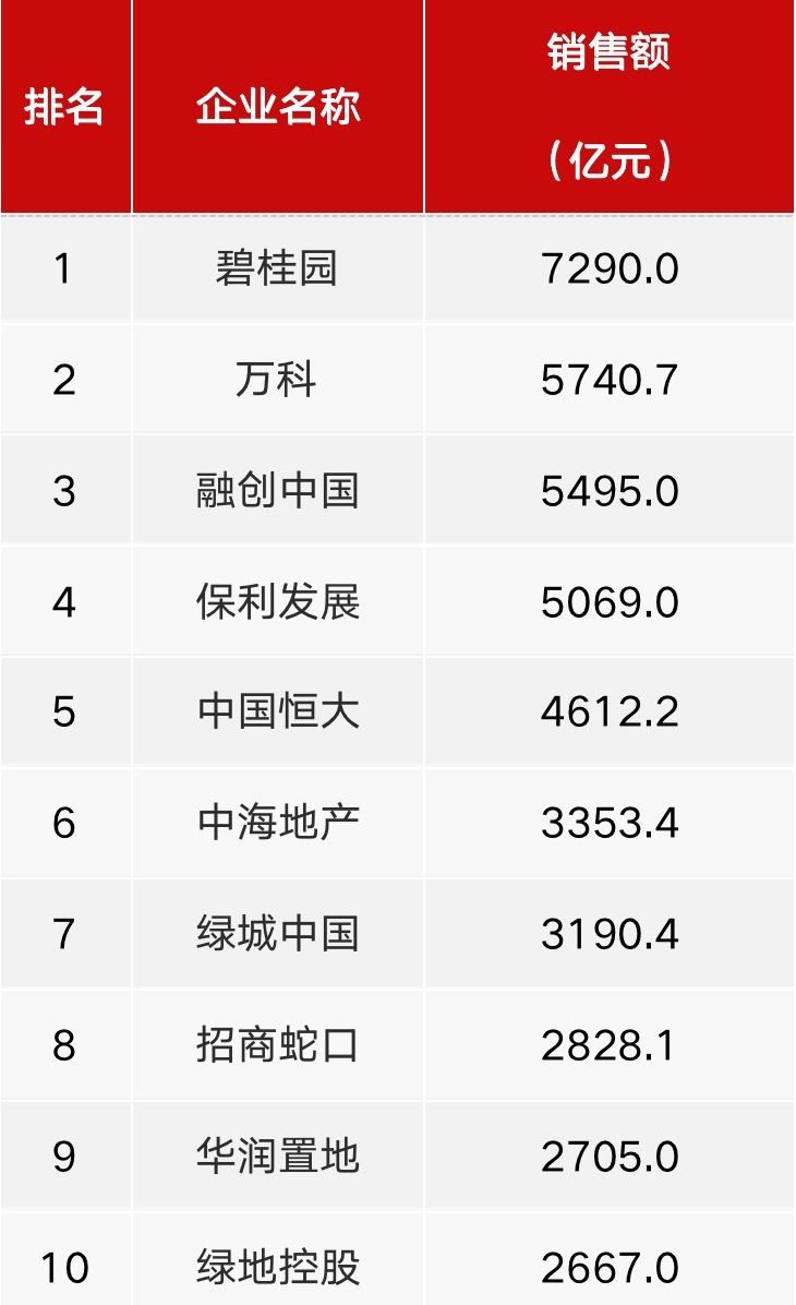 11月30日,多家机构发布1-11月房企销售业绩TOP100榜单。中指研究院数据显示,碧桂园以7290亿元累计业绩继续稳居首位,11月单月碧桂园实现销售529亿元;第二、三、四名分别为万科、融创中国、保利发展,并且均停留在5000亿元阵营。