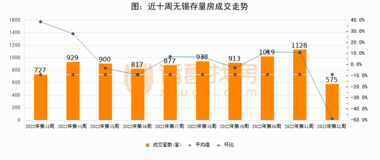 存量房方面,第53周无锡存量房成交575套,较上周减少553套,环比下降49%。从近十周成交走势来看,周均成交套数为882套,本周低于平均水平34.8%。