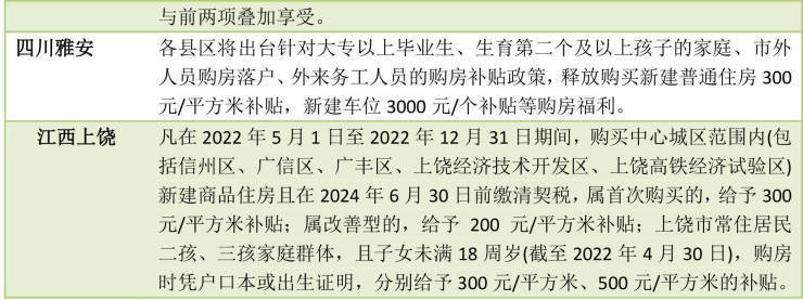 此外,多个城市推出真金白银的购房补贴。拿景德镇来说,景德镇市常住居民二孩、三孩家庭群体,且子女未满18周岁(截至2022年4月30日),购房时凭户口本或出生证明,分别给予200元/平方米、300元/平方米的补贴。