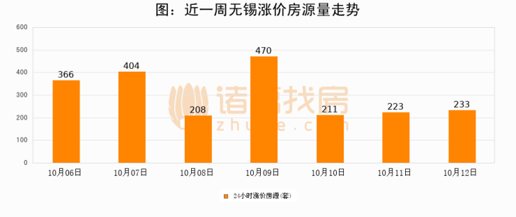 根据诸葛找房数据显示,无锡24小时涨价房源量为233套,较10月11日增加10套,环比上涨4.5%。与此同时,涨价房源占比小幅扩大,业主信心有所提升。