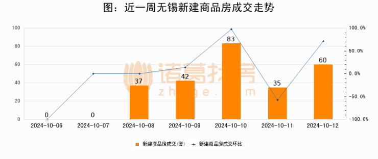 根据无锡市房地产市场管理和监测中心数据显示,2024年10月12日无锡新建商品房成交60套,较昨日增加25套,环比上涨71.4%