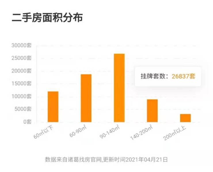 据诸葛找房数据显示,2021年4月20日无锡90-140平的房源数量最多,为26837套。