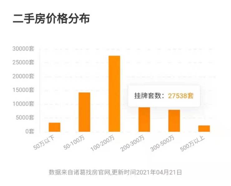 据诸葛找房数据显示,2021年4月20日无锡二手房价格在100-200万的房源数量居多,达到27538套。