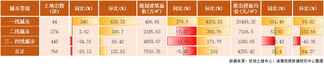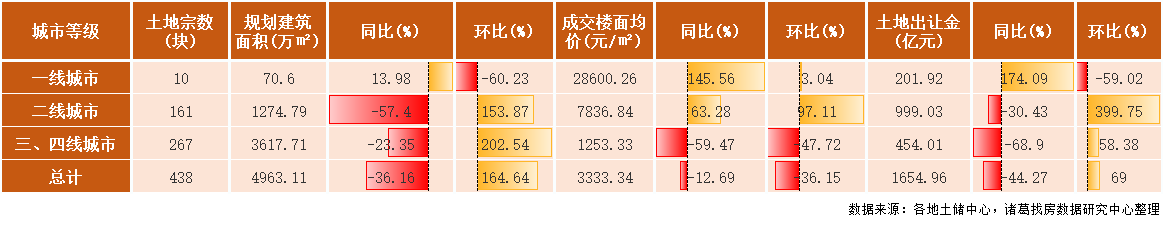 三四线城市土地成交267宗,土地成交规划建筑面积为3617.71万㎡,同比下跌23.35%,环比上涨202.54%;成交楼面价为1253.33元/㎡,同比下跌59.47%,环比下跌47.72%;土地出让金454.01亿元,同比下跌68.9%,环比上涨58.38%。
