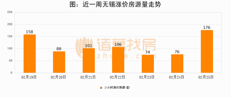 根据诸葛找房数据显示,无锡24小时涨价房源量为176套,较02月24日增加100套,环比上涨131.6%。与此同时,涨价房源占比小幅扩大,业主信心有所提升。