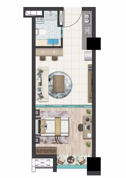 48㎡的SOHO户型,摒弃市面上常规的杂糅式布局,利用产品深度优势,餐、客、厨、卫各有专属空间,3.1米层高,空间更为朗阔。
