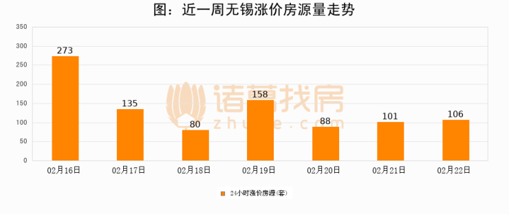 根据诸葛找房数据显示,无锡24小时涨价房源量为106套,较02月21日增加5套,环比上涨5%。与此同时,涨价房源占比小幅扩大,业主信心有所提升。