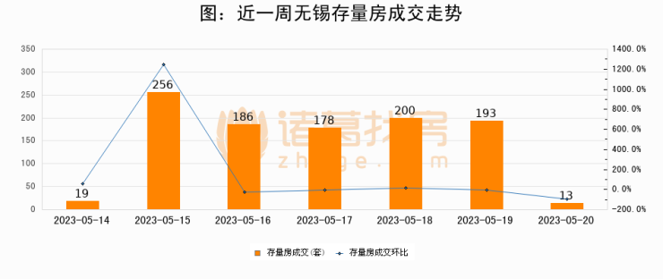 从存量房来看,2023年05月20日无锡存量房单日成交13套,比昨日减少180套,环比下降93.3%。从近一周存量房成交来看,无锡存量房日均成交套数为149套,05月20日单日成交13套,低于近一周平均水平91.3%。