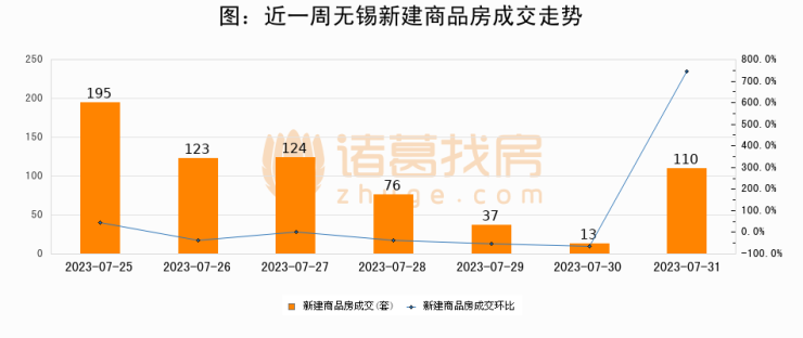 根据无锡市房地产市场管理和监测中心数据显示,2023年07月31日无锡新建商品房成交110套,较昨日增加97套,环比上涨746.1%