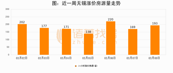 根据诸葛找房数据显示,无锡24小时涨价房源量为193套,较03月07日增加24套,环比上涨14.2%。与此同时,涨价房源占比小幅扩大,业主信心有所提升。