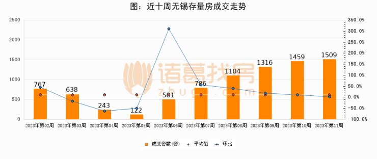 存量房方面,第11周无锡存量房成交1509套,较上周增加50套,环比上涨3.4%。从近十周成交走势来看,周均成交套数为844套,本周高于平均水平78.8%。