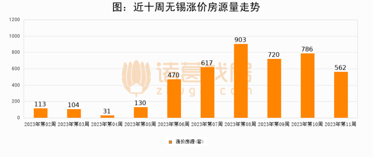 从调价房源来看,第11周无锡涨价房源562套,较上周下降28.5%。与此同时,11周涨价房源占比回落5.05个百分点,业主信心小幅波动,购房者可则需入市。