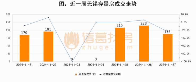 从存量房来看,2024年11月27日无锡存量房单日成交175套,比昨日减少53套,环比下降23.2%。从近一周存量房成交来看,无锡存量房日均成交套数为139套,11月27日单日成交175套,高于近一周平均水平25.9%。