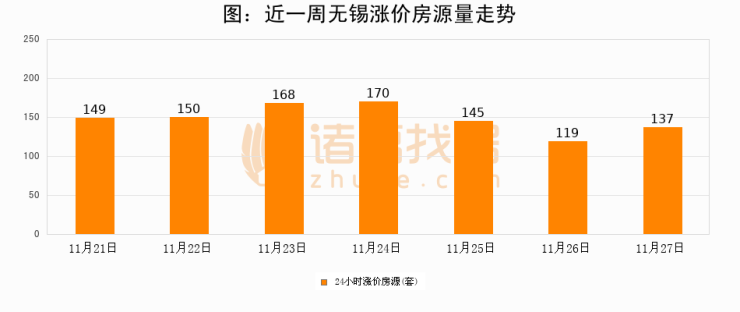 根据诸葛找房数据显示,无锡24小时涨价房源量为137套,较11月26日增加18套,环比上涨15.1%。与此同时,涨价房源占比小幅扩大,业主信心有所提升。