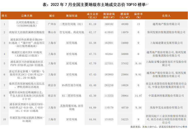从单幅地块成交总价上看,在全国7月成交总价前10幅地块之中,广州天河区燕塘地块(AT020883地块)位居成交总价榜首。上海则占据了其中6宗,且6宗地块溢价率均在9%以上。其中,由上海城建置业以底价55.38亿元竞得的上海市浦东新区外高桥新市镇G08-01地块,位居成交总价第3。