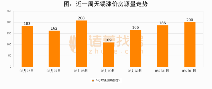 根据诸葛找房数据显示,无锡24小时涨价房源量为200套,较08月31日增加14套,环比上涨7.5%。与此同时,涨价房源占比小幅扩大,业主信心有所提升。