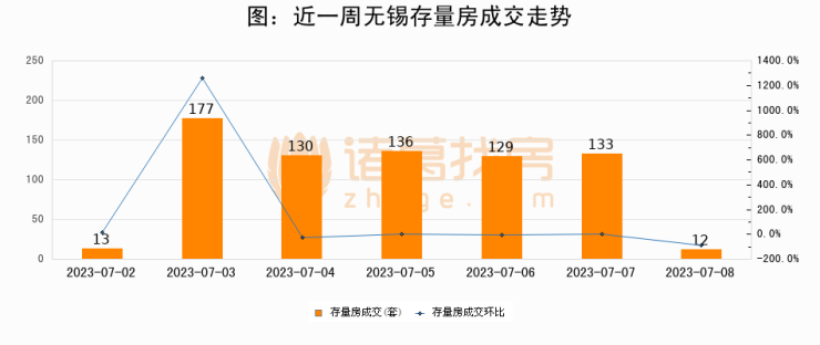 从存量房来看,2023年07月08日无锡存量房单日成交12套,比昨日减少121套,环比下降91%。从近一周存量房成交来看,无锡存量房日均成交套数为104套,07月08日单日成交12套,低于近一周平均水平88.5%。