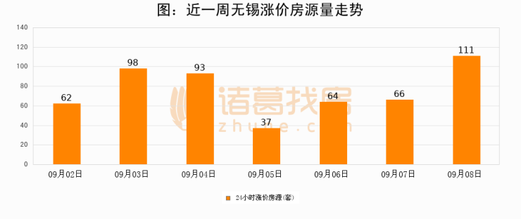 根据诸葛找房数据显示,无锡24小时涨价房源量为111套,较09月07日增加45套,环比上涨68.2%。与此同时,涨价房源占比小幅扩大,业主信心有所提升。