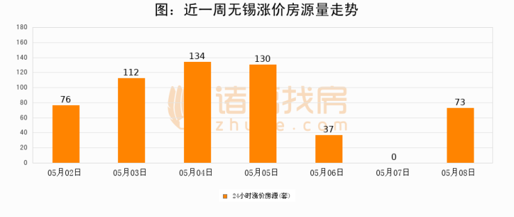 根据诸葛找房数据显示,无锡24小时涨价房源量为73套,较05月07日增加73套,环比上涨0%。与此同时,涨价房源占比小幅扩大,业主信心有所提升。