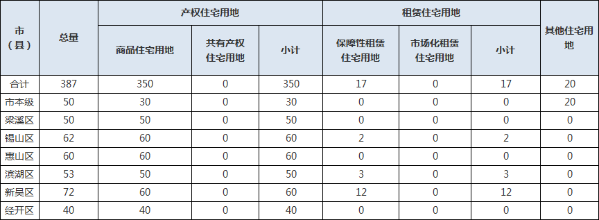 在区域分布上,市本级计划供应50公顷,其中20公顷其他住宅用地计划为市级统筹,按需供应,不再细分至各区;梁溪区计划供应50公顷;锡山区计划供应62公顷;惠山区计划供应60公顷;滨湖区计划供应53公顷;新吴区计划供应72公顷;经开区计划供应40公顷。