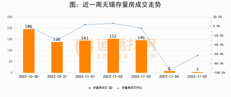 从存量房来看,2023年11月05日无锡存量房单日成交3套,比昨日减少5套,环比下降62.5%。从近一周存量房成交来看,无锡存量房日均成交套数为112套,11月05日单日成交3套,低于近一周平均水平97.3%。