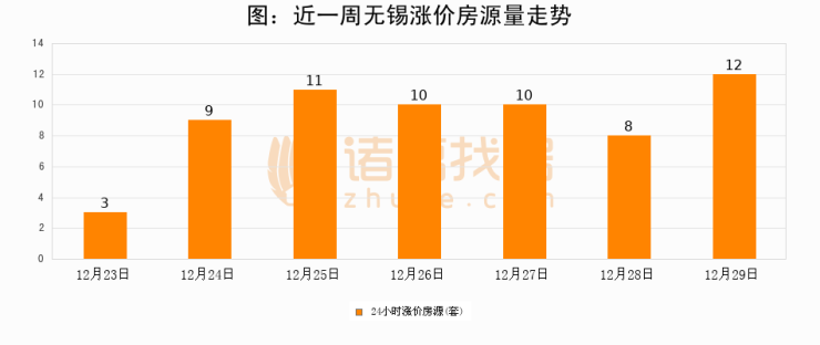 根据诸葛找房数据显示,无锡24小时涨价房源量为12套,较12月28日增加4套,环比上涨50%。与此同时,涨价房源占比小幅扩大,业主信心有所提升。